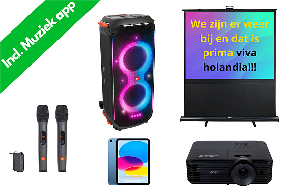 Deze set combineert een iPad, 2 draadloze JBL microfoons, de JBL Partybox 710 én een HD beamer met scherm.