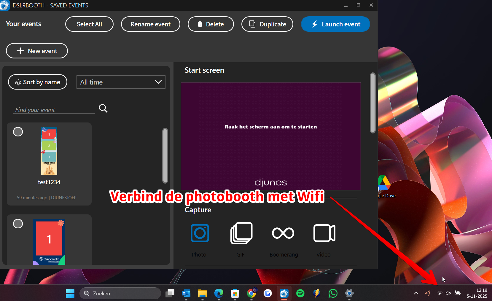Verbind de photobooth ondertussen met de Wifi zodat de QR code werkt. :)